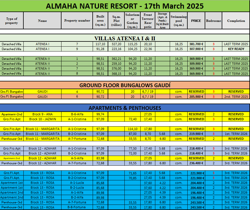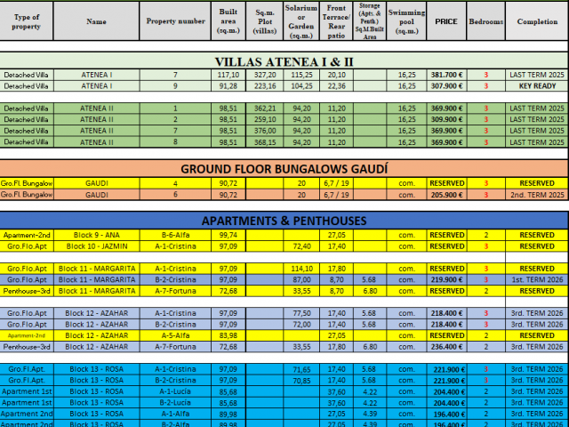 | REF | Naam | Slaapkamers | Badkamers | Plot | Prijs | Plannen |
