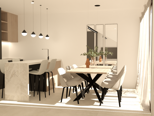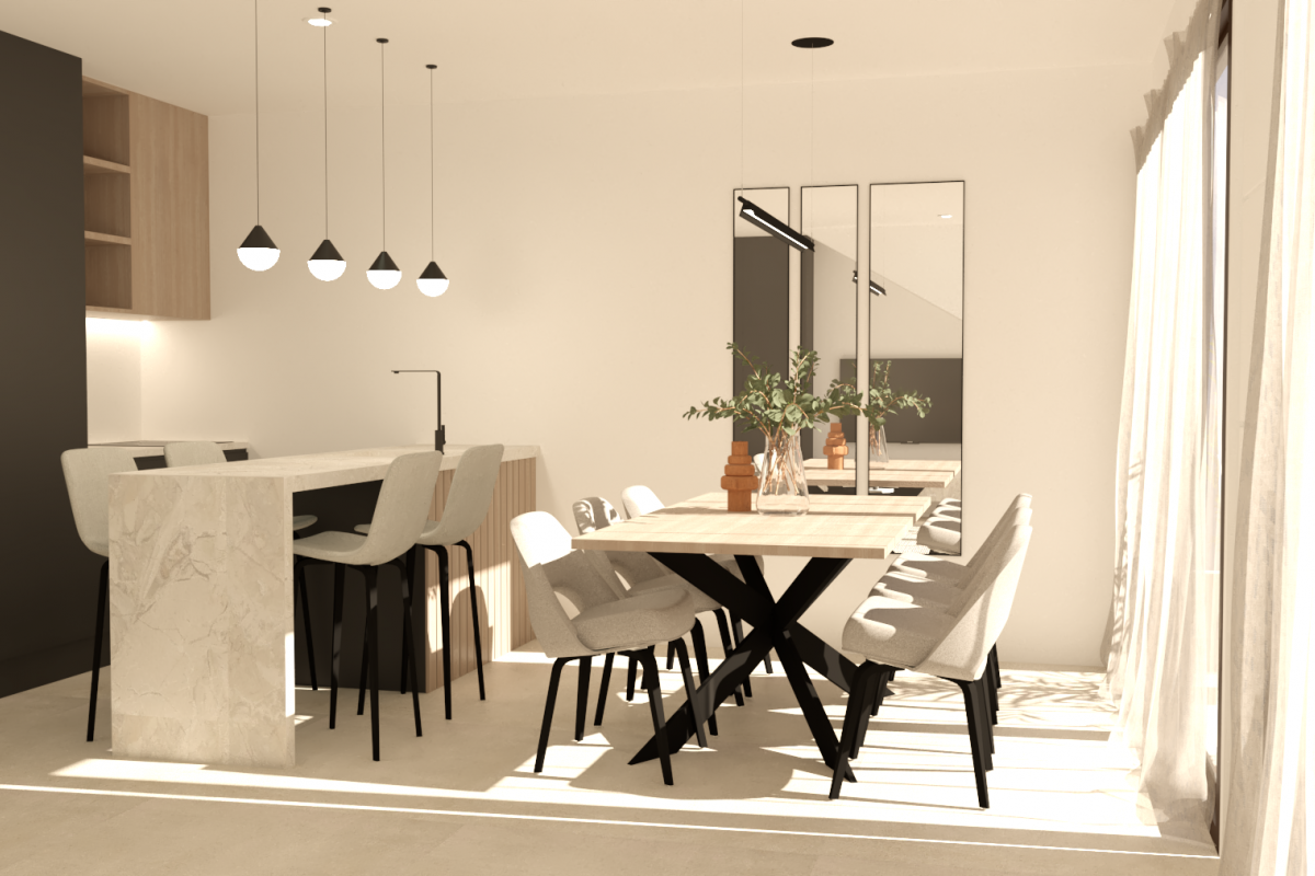De woningen zijn ontworpen met een eigentijdse stijl en een open concept, bestaande uit een ingerichte keuken en een woon-eetkamer.